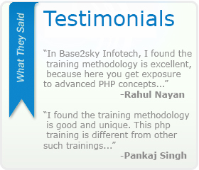 Base2sky Infotech offers training to MCA/B.E/B.Sc/BCA/Graduate with Live project by Industry Professional using .NET/PHP/WPF/MS-SQL,MYSQL/LINUX/ORACLE technology to develop skills as per industry standard. Our company also offers Internship for MCA/BE/B.Sc/MMS/MBA students as per course curriculum. Many students have completed their academic curriculam activity at Base2sky Infotech. We also provide practical training (project based) to passed out students so that they get hand on experience on the latest technologies.